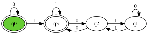 したがって、$q_{0}$と$q_{3}$がオートマトンの受理状態であるから、001001は受理される。