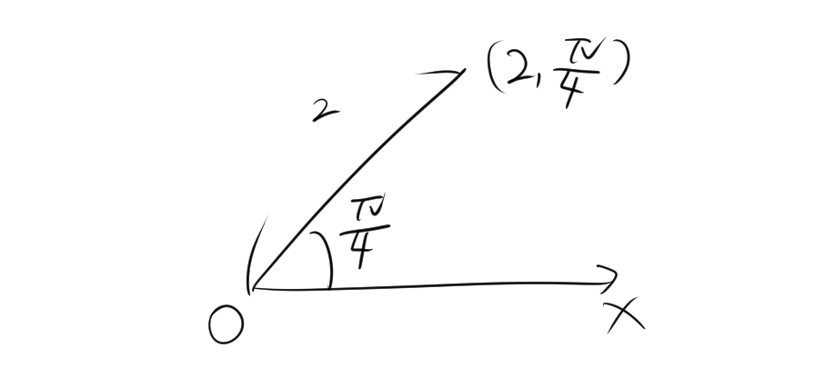 例えば、点 \(P\) が原点から距離 \(r = 2\)、角度 \(\theta = \frac{\pi}{4}\) の位置にある場合、その極座標は \(P(2, \frac{\pi}{4})\) です。