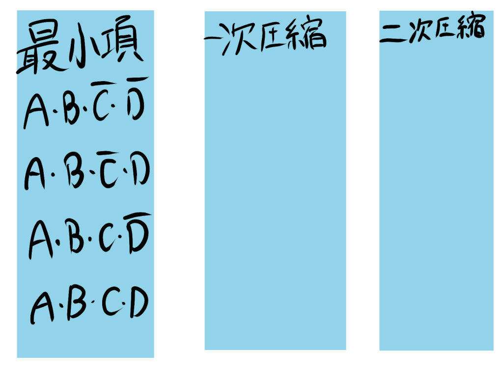 次に、step2の圧縮表を作ります。まず、一番左に、最小項を2進数の数が小さい順に並べます。