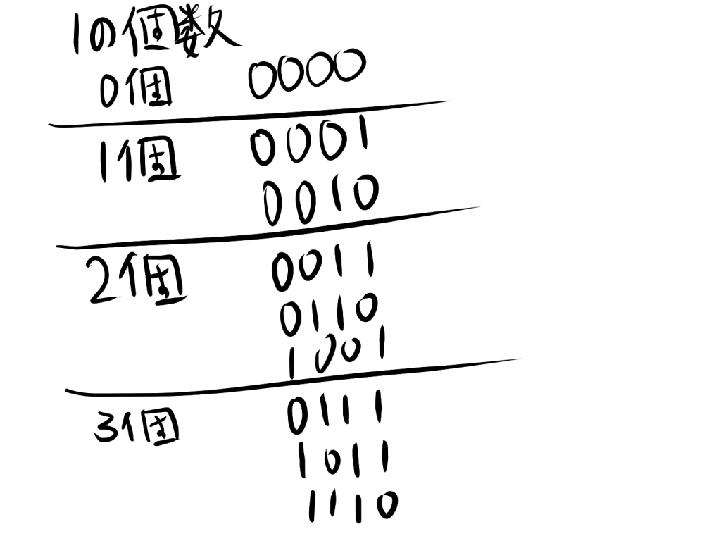 となる。最小項を2進数に対応させた数の1の個数に関して着目し表をつくる。
