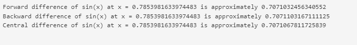 print(f"Central difference of sin(x) at x = {x} is approximately {central_diff}")