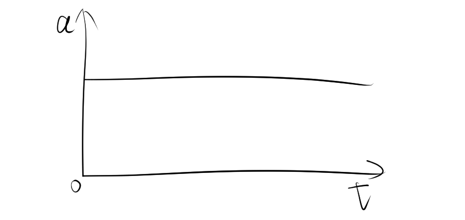 グラフ上では、水平な直線で表されます。これは、加速度が変化せず一定であることを意味します。たとえば、物体が自由落下している場合、重力加速度は約 \( 9.8 \, \text{m/s}^2 \) で一定です。