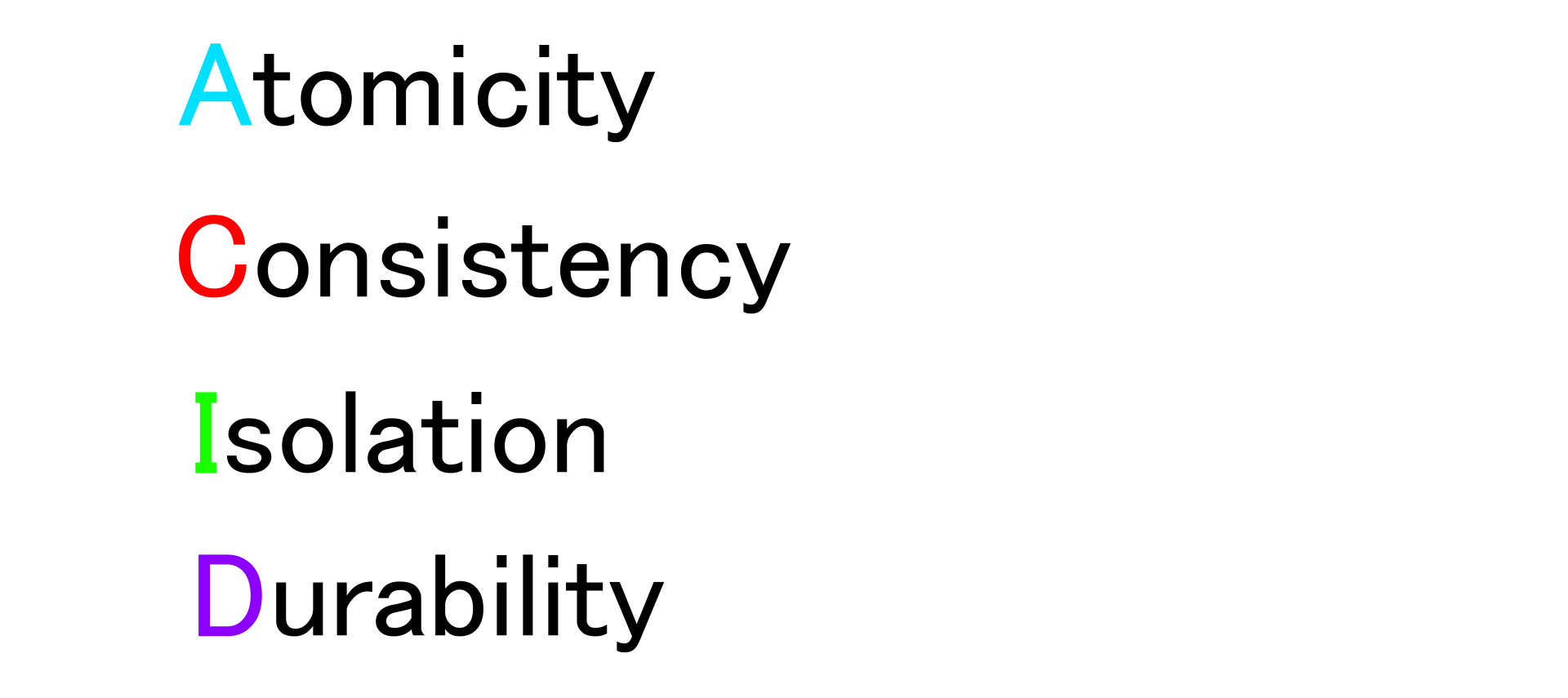 ACID特性(acid properties)は、データベースが信頼性と整合性を保つために必要な4つの基本原則を指します。ACIDとは次の4つの特性の頭文字からとっています。