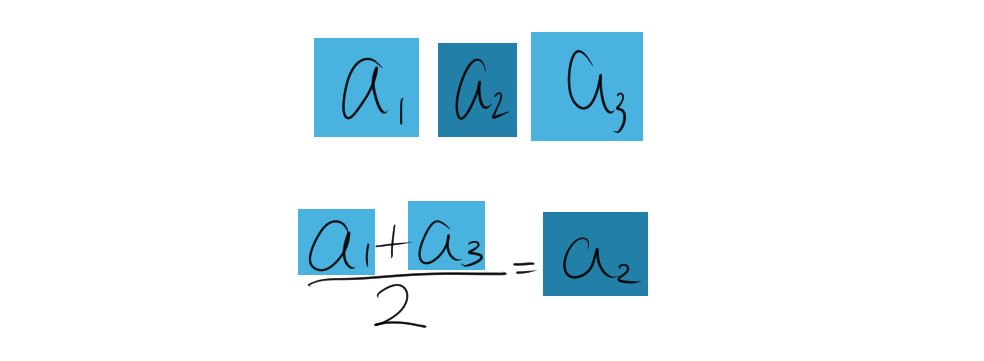 \[\begin{align*} \frac{a_{n-k} + a_{n+k}}{2} &= \frac{\left( a_1 + (n-k-1) d \right) + \left( a_1 + (n+k-1) d \right)}{2} \\ &= \frac{2a_1 + (n-k-1)d + (n+k-1)d}{2} \\ &= \frac{2a_1 + (n-1)d + (n-1)d}{2} \\ &= \frac{2a_1 + 2(n-1)d}{2} \\ &= a_1 + (n-1)d \\ &=a_n \end{align*}\]