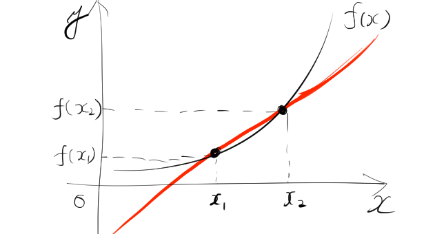 これは、関数 \( f(x) \) のグラフ上の \( (x_1, f(x_1)) \) と \( (x_2, f(x_2)) \) という2つの点を結んだ直線の傾きに対応します。直線の傾きは、2点間での \(x\) の変化に対する \( f(x) \) の変化の割合を示しており、この傾きが平均変化率です。