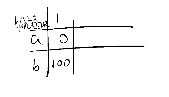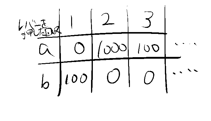 たとえば、スロットマシンが2台(a, b)あるとします。それぞれのレバーを引いたときに得られる報酬(コインの枚数)を以下の表にまとめます。