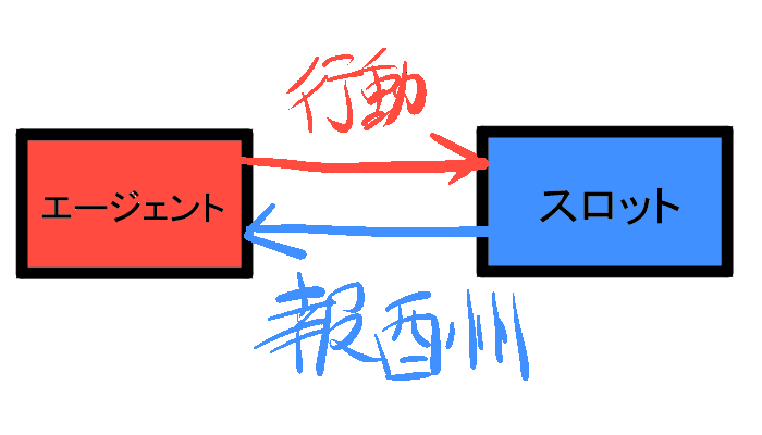 エージェントは、どのスロットマシンのレバーを引くかを決定し、その選択に応じて報酬を受け取ります。この関係を図で示すと、以下のような構図になります。