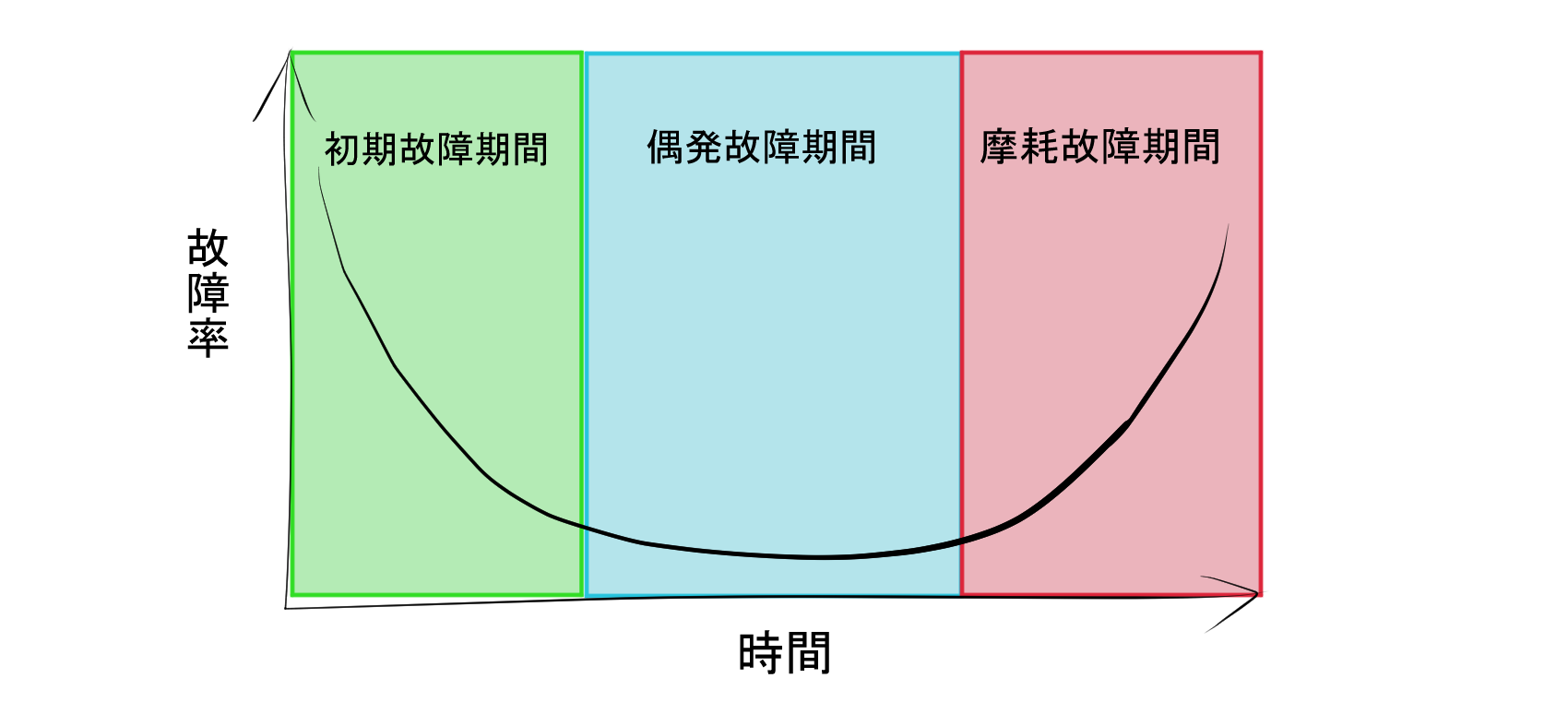 - 初期故障期間、偶発故障期間、摩耗故障期間の3段階に分けられる。