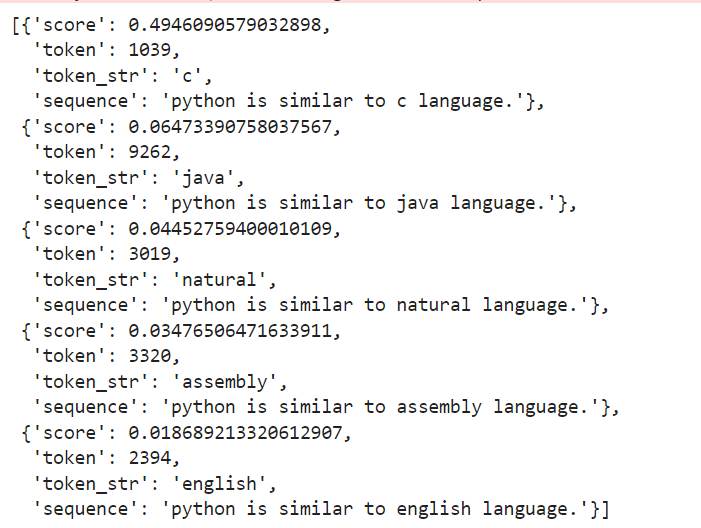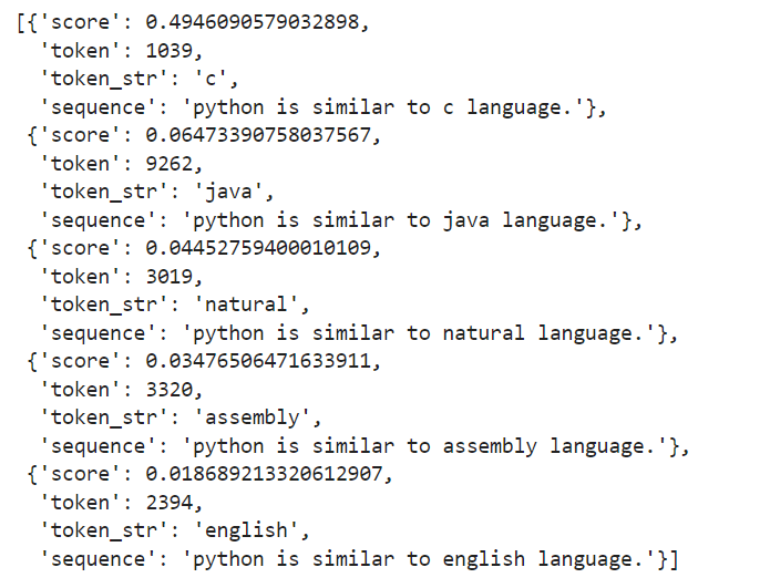 入力文 “python is similar to [MASK] language.” をモデルに渡します。文中の [MASK] トークンが予測対象となります。モデルはこのマスクされた単語を予測します。