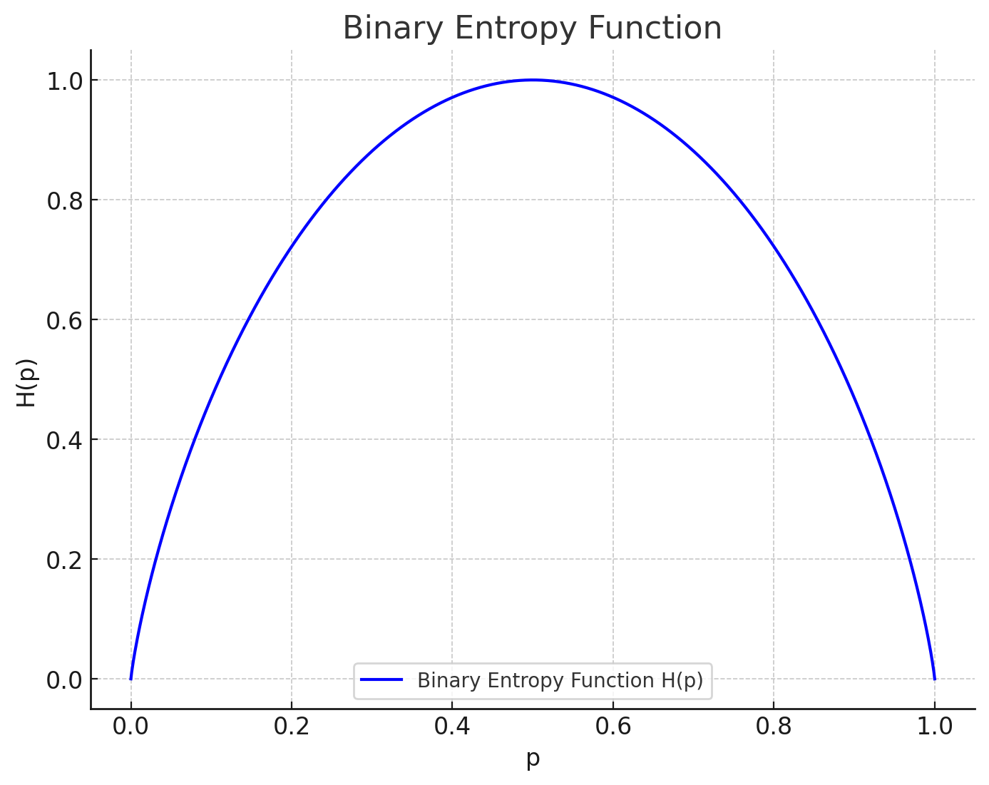 \[ H(p) = -p \log_2(p) - (1 - p) \log_2(1 - p) \]