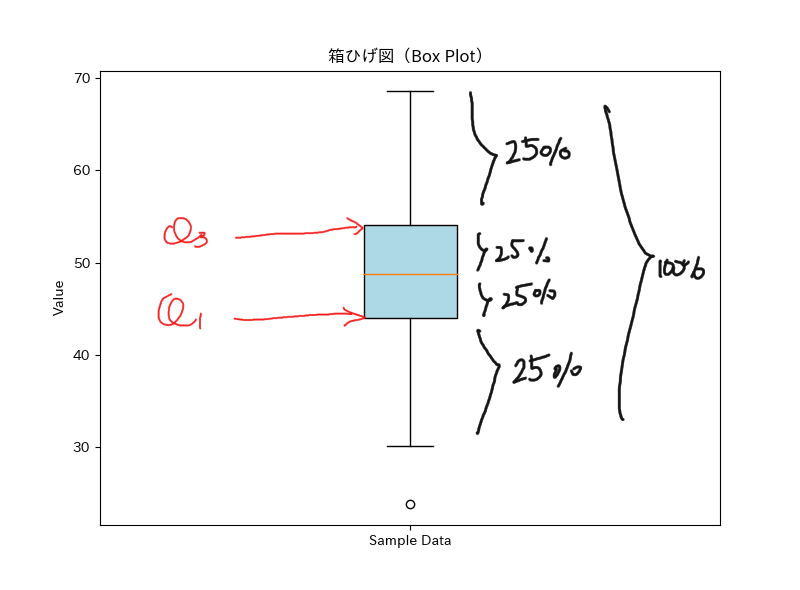 - 第一四分位数(Q1, 25%分位点): データの下位25%の値