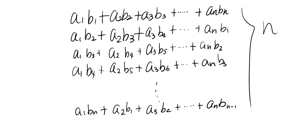 $$\begin{cases} a_1b_1+a_2b_2+\cdots +a_nb_n &= a_1b_1+a_2b_2+\cdots +a_nb_n \geq a_1 b_n + a_2 b_{n-1} + \cdots + a_n b_1\\ a_1b_1+a_2b_2+\cdots +a_nb_n &\geq a_1b_2+a_2b_3+\cdots +a_nb_1\geq a_1 b_n + a_2 b_{n-1} + \cdots + a_n b_1\\ a_1b_1+a_2b_2+\cdots +a_nb_n &\geq a_1b_3+a_2b_4+\cdots +a_nb_2\geq a_1 b_n + a_2 b_{n-1} + \cdots + a_n b_1 \\ a_1b_1+a_2b_2+\cdots +a_nb_n &\geq a_1b_4+a_2b_5+\cdots +a_nb_3 \geq a_1 b_n + a_2 b_{n-1} + \cdots + a_n b_1\\ &\vdots \\ a_1b_1+a_2b_2+\cdots +a_nb_n &\geq a_1b_n+a_2b_1+\cdots +a_nb_{n-1}\geq a_1 b_n + a_2 b_{n-1} + \cdots + a_n b_1\\ \end{cases}$$