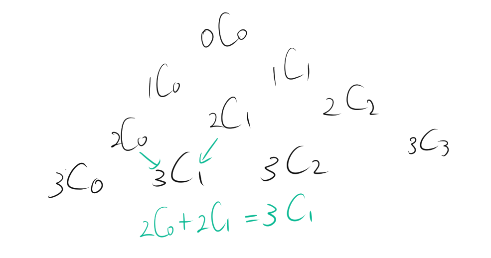 このように、パスカルの三角形は隣り合う項を足し合わせると、その間にある下の項になるという関係が成り立ちます。実際に、パスカルの三角形では、${}_{2}\mathrm C _{0} +{}_{2}\mathrm C _{1} = {}_{3}\mathrm C _{1}$となるように、先ほど証明した式が成り立つことを確認することができます。