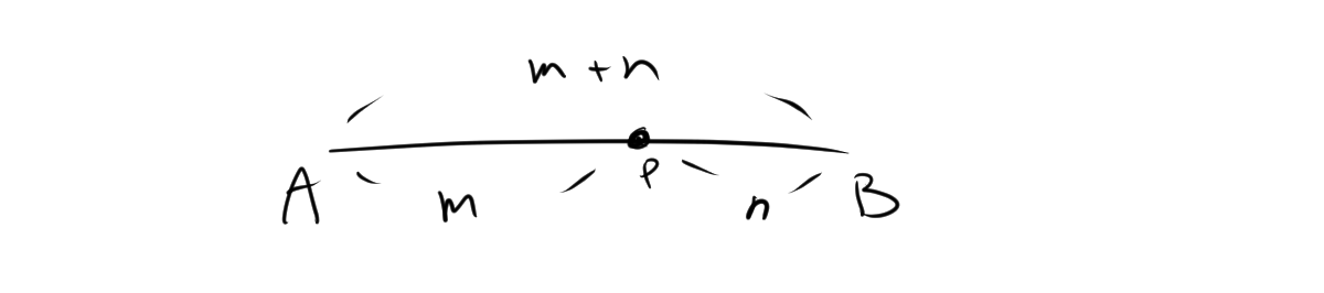 内分点とは、2点 \(A\) と \(B\) を結ぶ線分上のある点 \(P\) が、その線分を特定の比で分けることを指します。具体的には、点 \(P\) が線分 \(AB\) を \(m:n\) の比で分けるとき、点 \(P\) を 内分点 といいます。