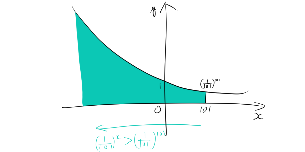 $\left(\frac{1}{101}\right)^x > \left(\frac{1}{101}\right)^{101} $となる範囲は、$x<101$となっています。