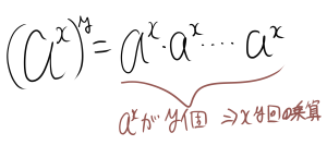 次に、$(a^{x})^{y}$を考えます。これは、$a$を$x$回かけたものを、$y$回かけたものをかけたものです。したがって、