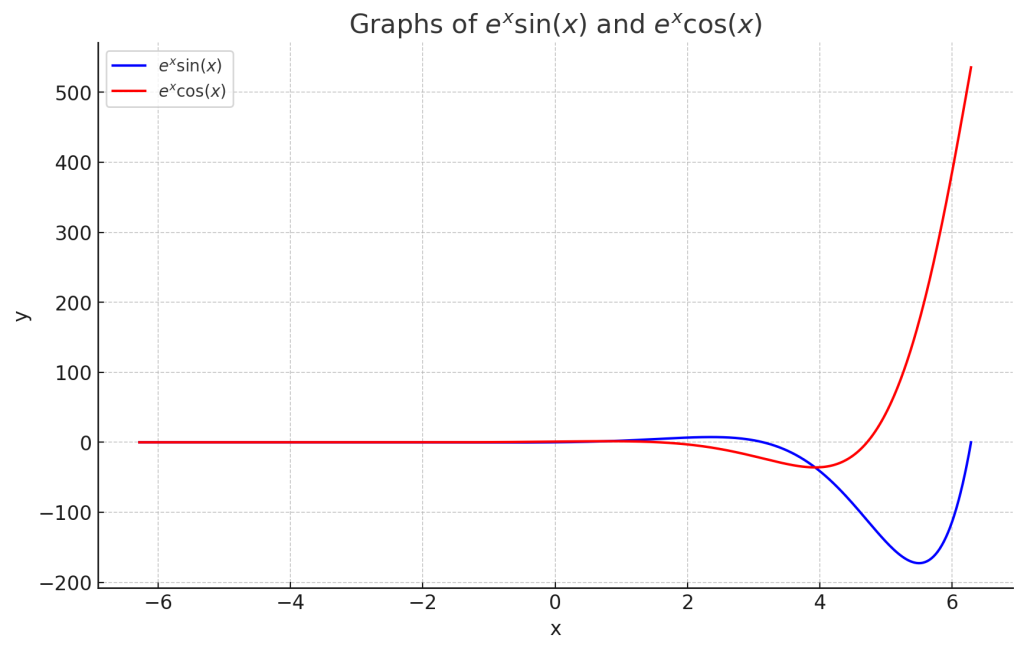 $e^x\sin x$と$e^x\cos x$をプロットすると次のようなグラフになります。