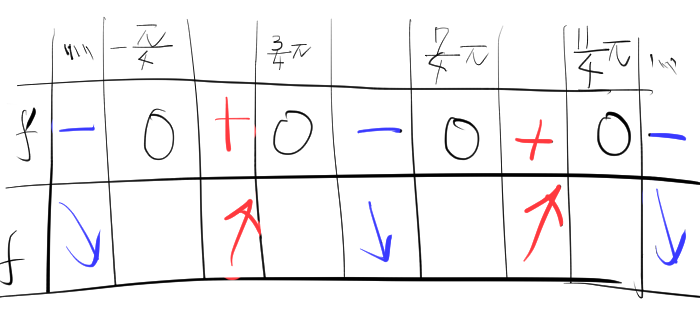 \[ f'(x) = e^x (\cos x + \sin x) = 0 \]