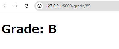 ブラウザで http://127.0.0.1:5000/grade/85 にアクセスすると、「Grade: B」と表示されます。