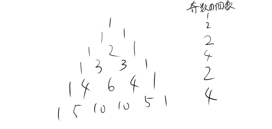 4行目: 1, 3, 3, 1(奇数は4つ)
