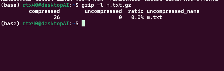 このコマンドを実行すると、m.txt.gz の圧縮前と圧縮後のサイズや圧縮率などが表示されます。
