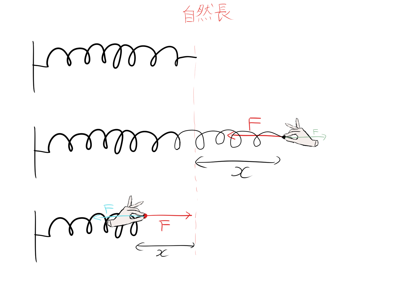 【図解】ばねとフックの法則F=-kxの意味と単位、自然長について