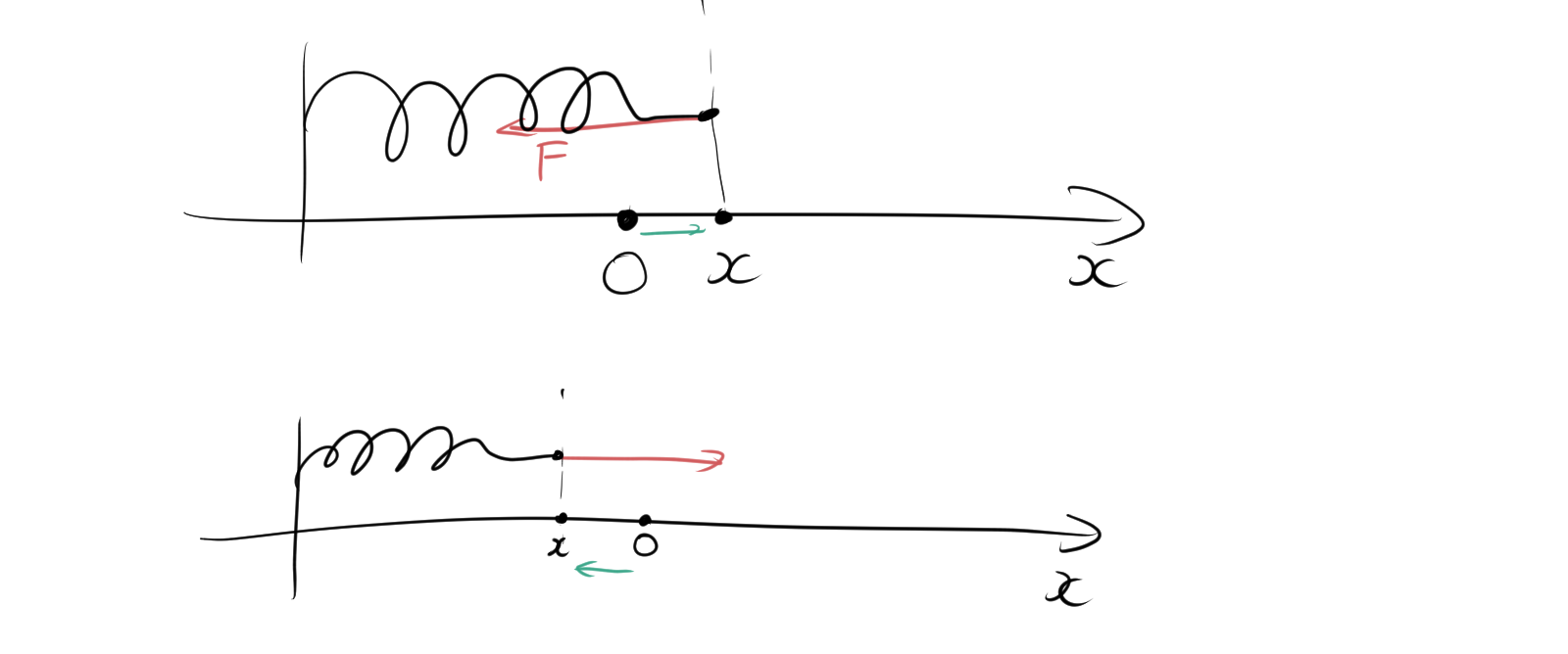 先ほど説明したように、作用反作用の法則によって、ばねに力 \(F\) が働いています。これに基づき、次の2つのケースが考えられます。自然長の位置をOとしてx軸上のばねにかかる力と変位xを考えます。