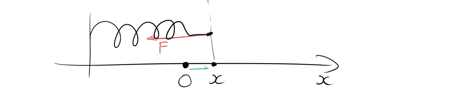 ばねが縮む場合は、力 \(F\) が \(x\) 軸と同じ方向に働き、変位はその逆方向に進みます。この場合の式は次のようになります。