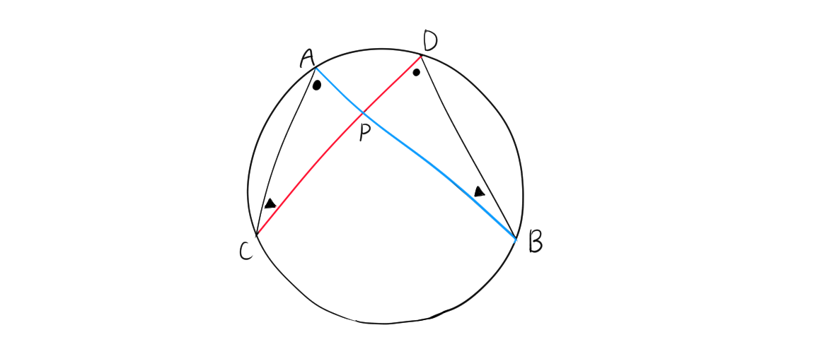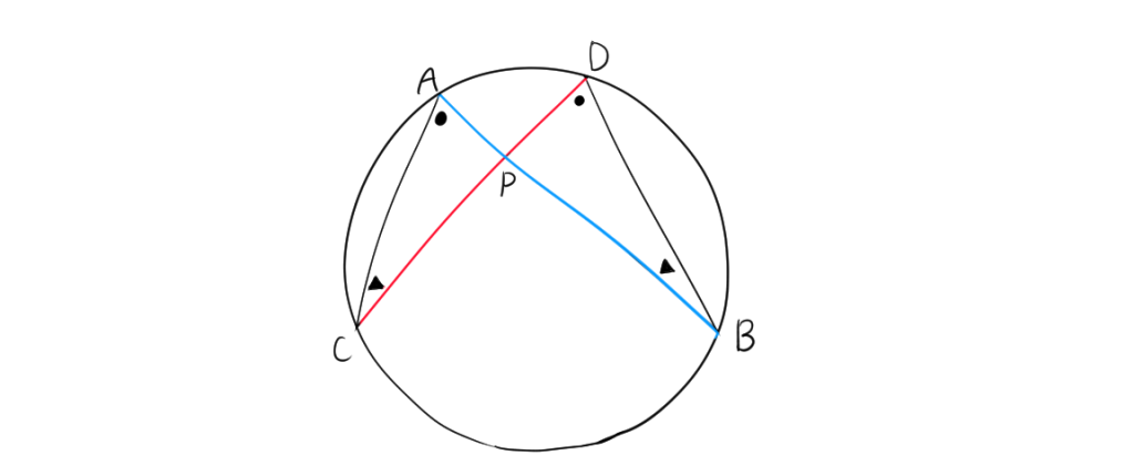 同様にC,Dが円上に存在して、点Pと共通の線分に存在するので、