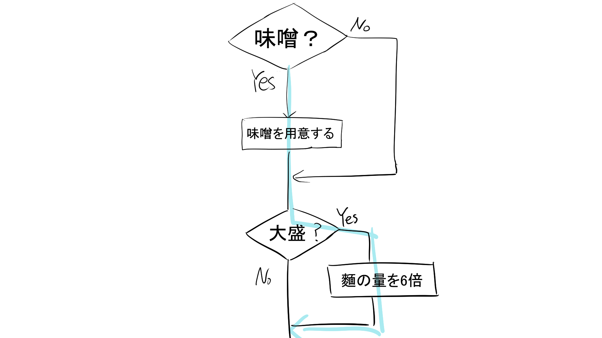 ここで、「味噌を用意する」と「麺の量を6倍にする」という特別な命令を分岐で行います。