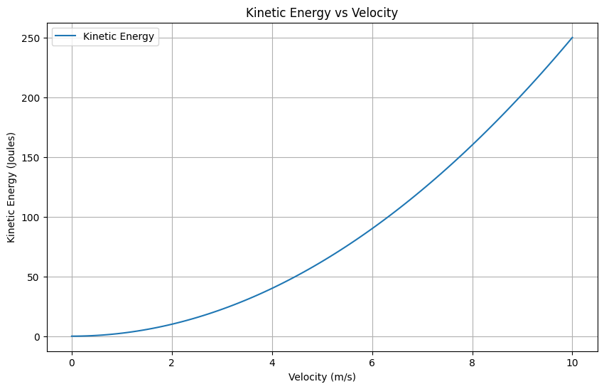 - 速度(\( v \)):物体の速度は、その物体が移動する速さを示します。速度が速いほど、運動エネルギーは大きくなります。特に、速度は二乗されるため、速度が増えると運動エネルギーは非常に大きく増加します。