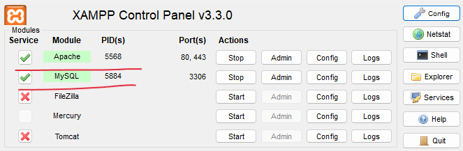 XAMPPを起動し、コントロールパネルからApacheとMySQLを「Start」に設定します。