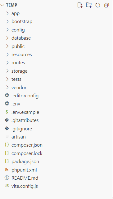 インストールが完了すると、Laravelのファイルがプロジェクトフォルダに展開されます。