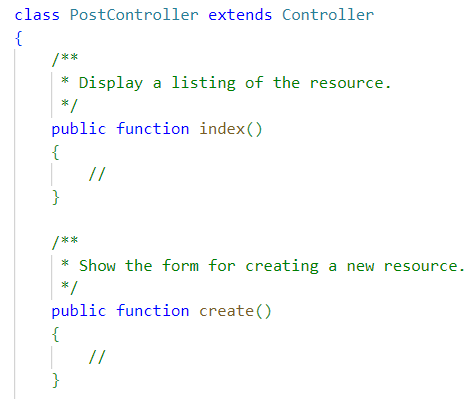 このコマンドを実行すると、App/Http/Controllers/PostController.php ファイルが生成されます。このファイルには、以下の7つのメソッドがあらかじめ用意されています。