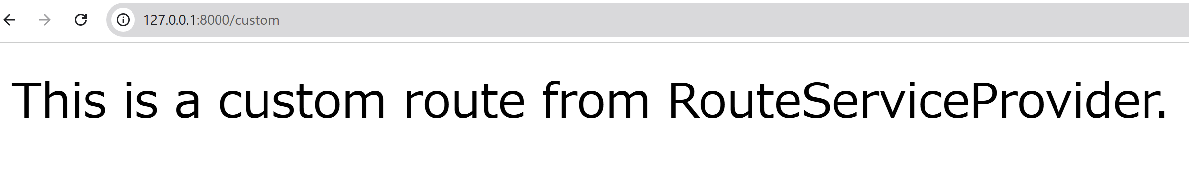 これで、web.phpの中でcustom_routes.phpに定義したルートも動作するようになります。実際に、ルートに移動すると、