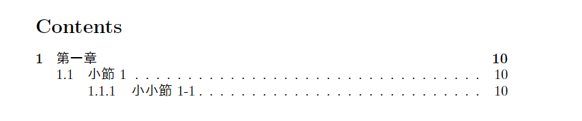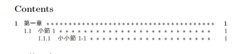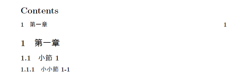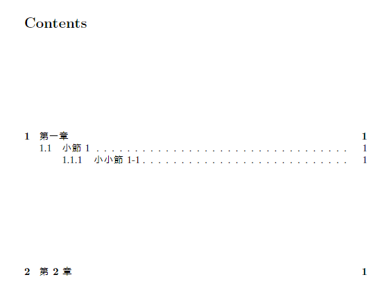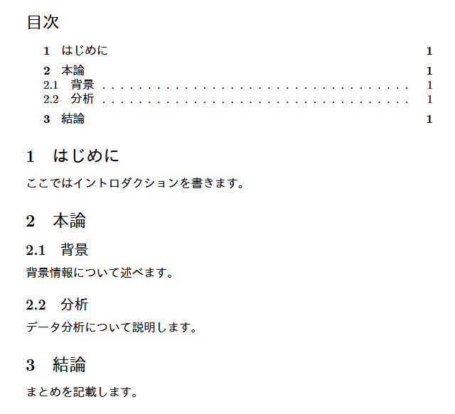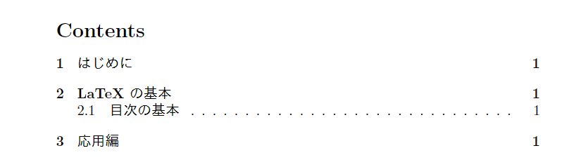 目次には自動的に各項目のページ番号が表示されます。ページ番号を調整したい場合は、\setcounter コマンドを使用して変更できます。