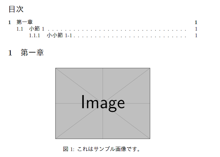 上記のコードをコンパイルすると、タイトルの下に目次が表示されます。目次には、section や subsection などの見出しが自動的にリスト化されます。手書きで、目次の番号を書かなくていいのはすごく楽ですね。