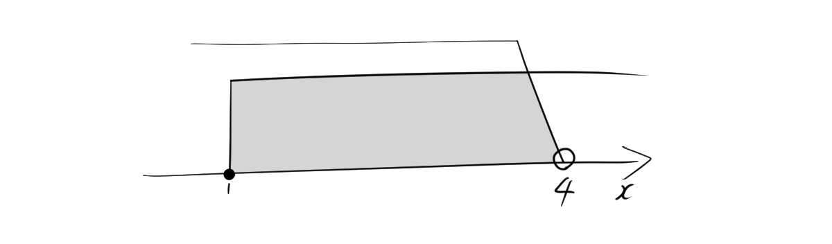 \[ x \geqq 1 \quad \text{かつ} \quad x < 4 \]
