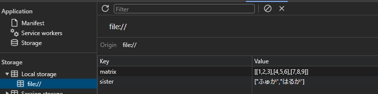 検証(F12をクリック)のアプリケーションを見るとLocalStorageの中身を確認することができる。