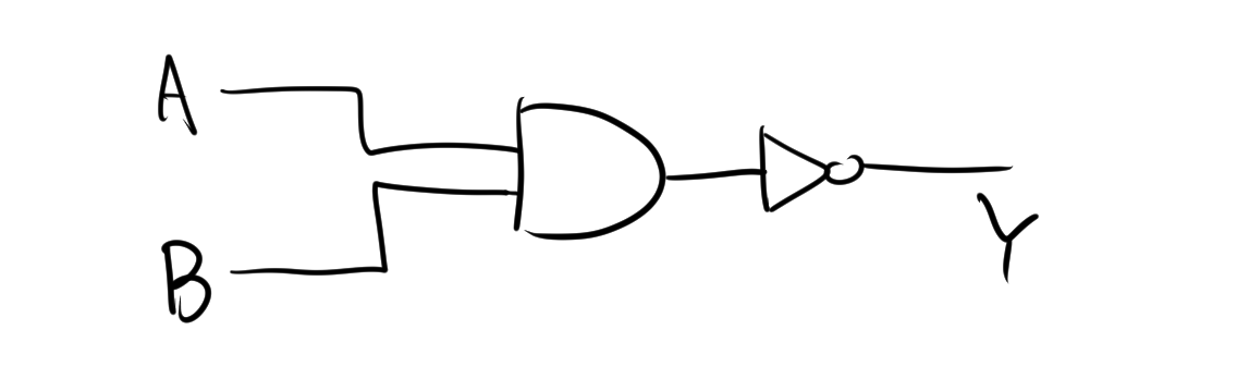 $Y=\overline{A\cdot B} $より、NANDゲートをANDとNOTで構成すると次のような回路になります。