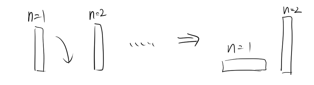 図のように、n=1のドミノが倒れたとしても、n=2は倒れません。もしかしたら、倒れるかもしれませんが、必ずすべてのドミノが倒れるとは限りません。