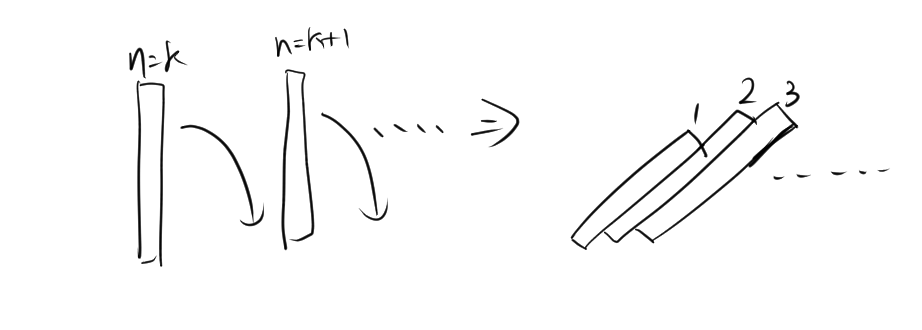 では、仮にあるkが倒れるときに、k+1が倒れるとすると、n=1(一番左端にある)のドミノが倒れるので、n=2のドミノが倒れます。同様に、