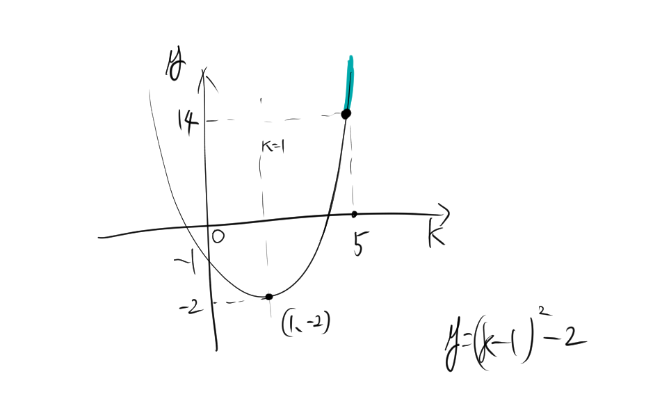 $k\geq 5$であるので、青色の範囲の部分になるため、$ (k-1)^2-2$の最小値はk=5のときであるので、