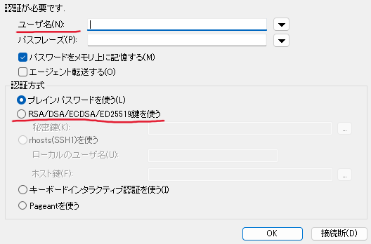 - 秘密鍵: RSA/DSA/EDSA/ED25519鍵を使うを選択して、id_rsaのパスを選択する。