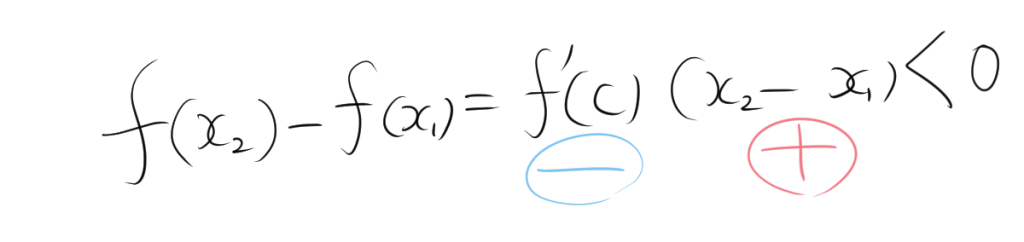 ここで、\( f'(c) < 0 \) 、$x_2-x_1>0$なので、\( f(x_2) – f(x_1) < 0 \)、つまり \( f(x_2) < f(x_1) \) です。したがって、\( f(x) \) は \( I \) で単調減少であることが証明されます。