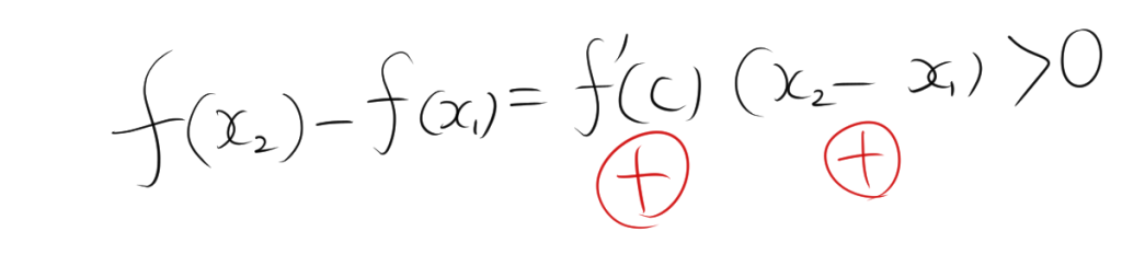 ここで、\( f'(c) > 0 \) 、$x_2-x_1>0$なので、\( f(x_2) – f(x_1) > 0 \)、つまり \( f(x_2) > f(x_1) \) です。よって、\( f(x) \) は \( I \) で単調増加します。