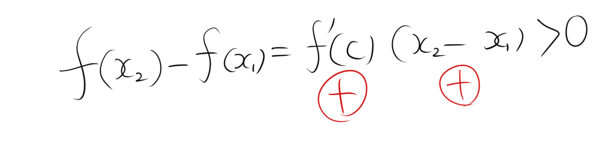ある区間 \( I \) で \( f'(x) > 0 \) が常に成り立つと仮定します。任意の \( x_1, x_2 \in I \) に対して、\( x_1 < x_2 \) ならば、平均値の定理より、ある \( c \in (x_1, x_2) \) が存在して次の関係が成り立ちます。