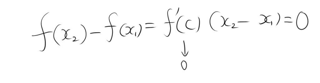 ここで、\( f'(c) = 0 \) なので、\( f(x_2) – f(x_1) = 0 \)、つまり \( f(x_2) = f(x_1) \) です。よって、関数 \( f(x) \) は区間 \( I \) で定数です。