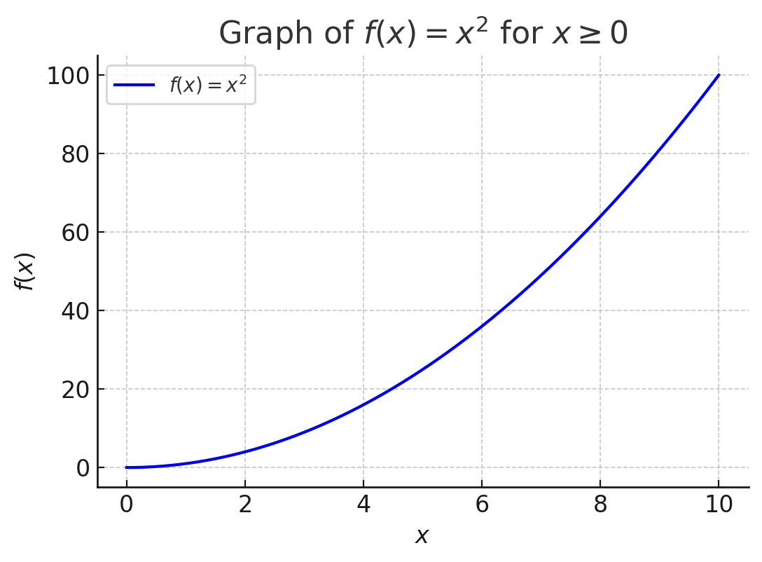 関数 \( f(x) = x^2 \) を考えましょう。この関数は、区間 \( x \geq 0 \) では単調増加です。つまり、\( x \) が増えると \( f(x) \) も増加します。