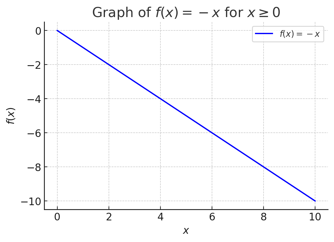 関数 \( f(x) = -x \) を考えます。この関数は、任意の \( x \) に対して単調減少です。つまり、\( x \) が増えると \( f(x) \) の値が減少します。